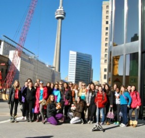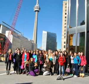 Aujourd’hui, une journée de découverte attendait nos élèves. Tout a commencé par une ballade dans le métro de Toronto qui était rempli à ras bord compte tenu de l’heure de pointe matinale. Les filles n’en croyaient pas leurs yeux. Par la suite, nous avons eu droit à une visite haute en couleur à la tour du CN. Nous avons pu admirer le panorama de la ville, le plancher de verre et un tout petit aéroport sur le lac Ontario. Les filles ont bien aimé.