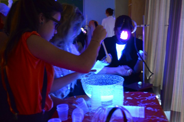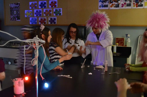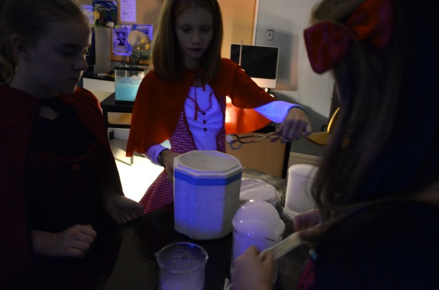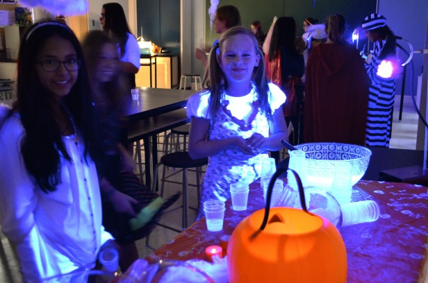 En première secondaire, la fête d’Halloween s’est donné des airs d’expérience scientifique. En effet, les élèves, vêtues de costumes plus inventifs les uns que les autres, ont été invitées à réaliser quelques expérimentations phosphorescentes, dans le noir. Leur enseignant, monsieur Rémi Auger, lui-même déguisé en scientifique fou, et la technicienne en laboratoire, madame Marie-Eve Boudreau, ont eu cette belle initiative de combiner Halloween et pédagogie. Qui a dit qu’on ne pouvait apprendre en s’amusant?