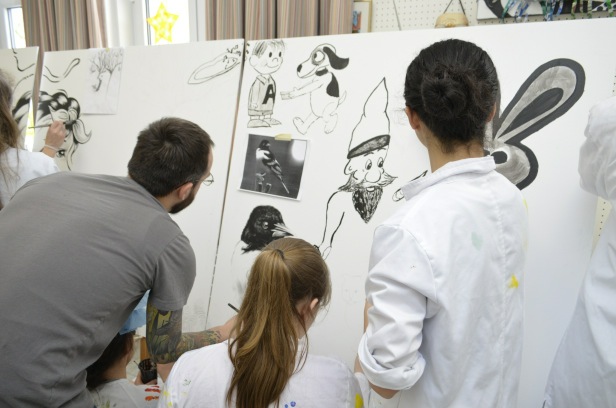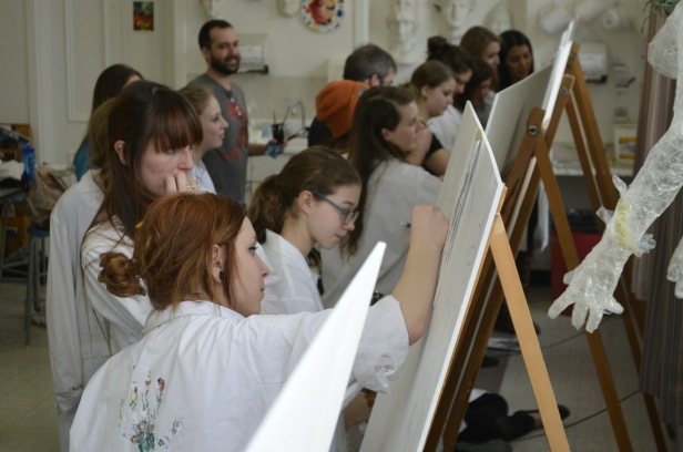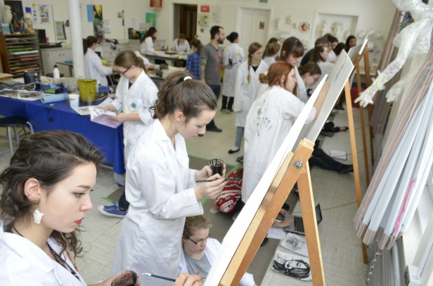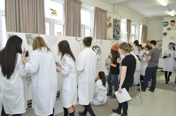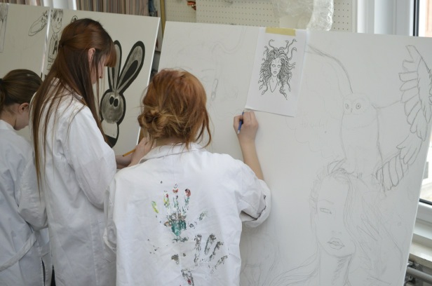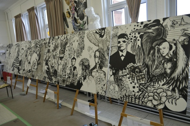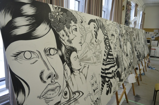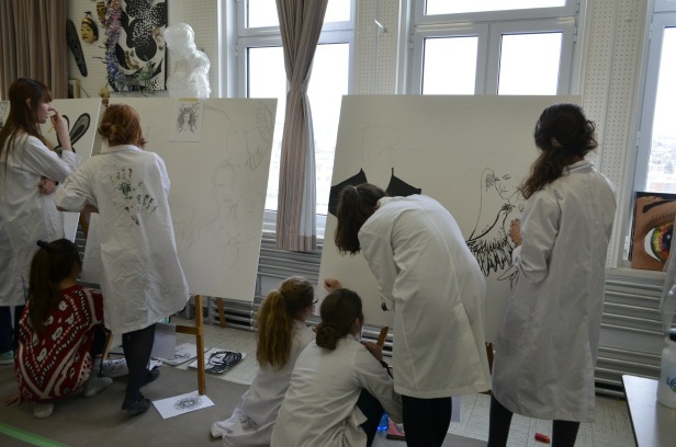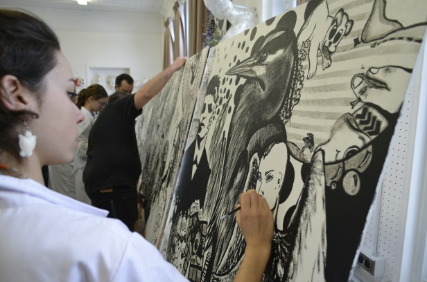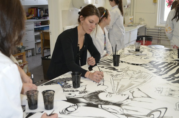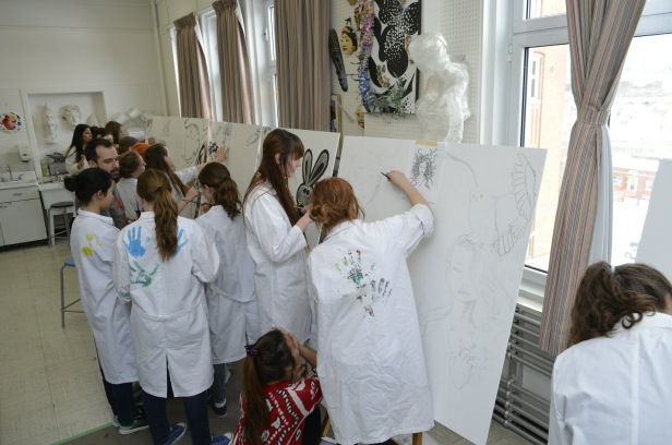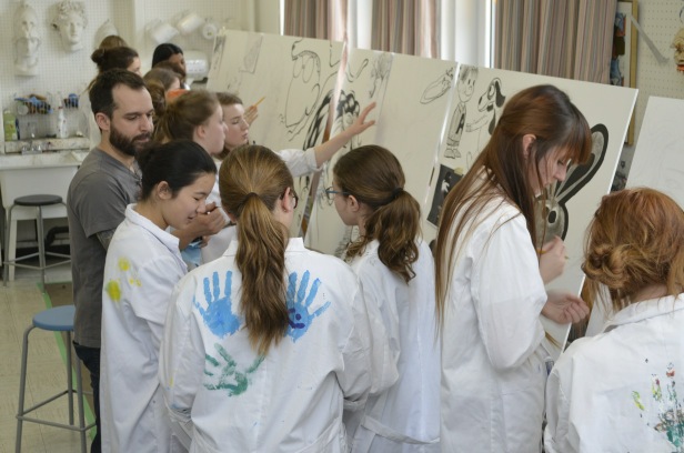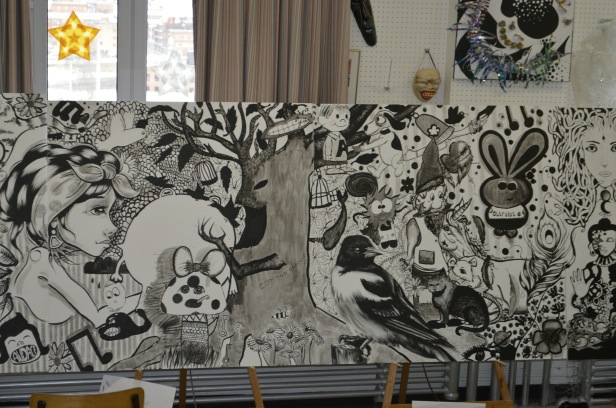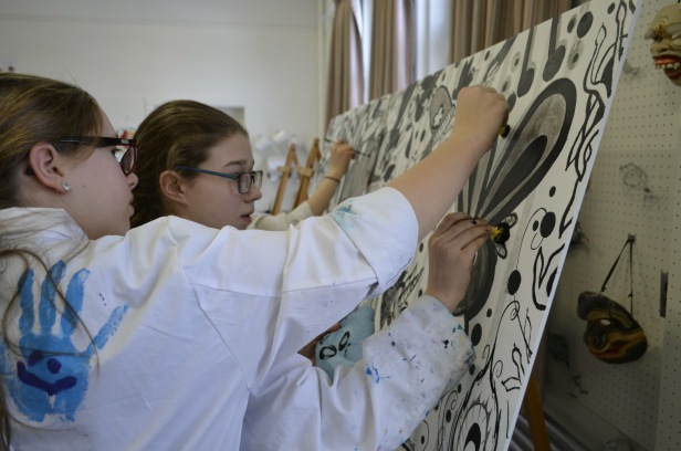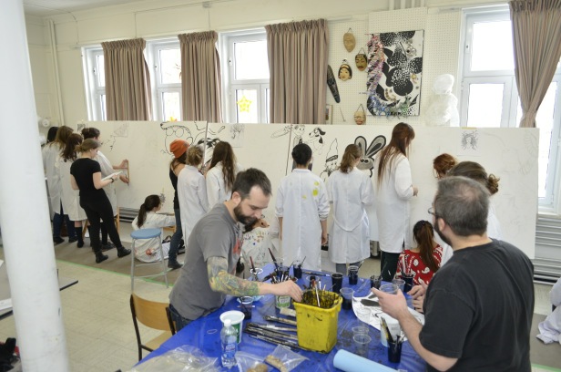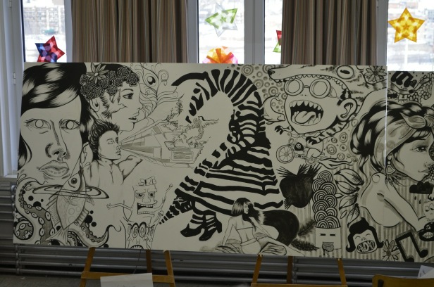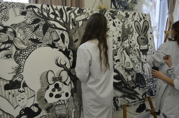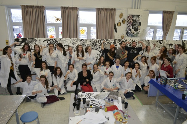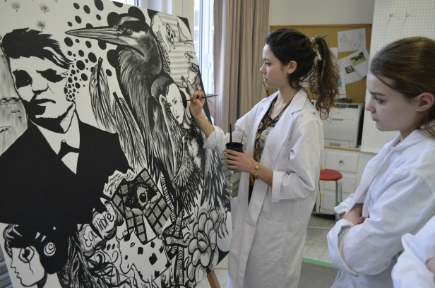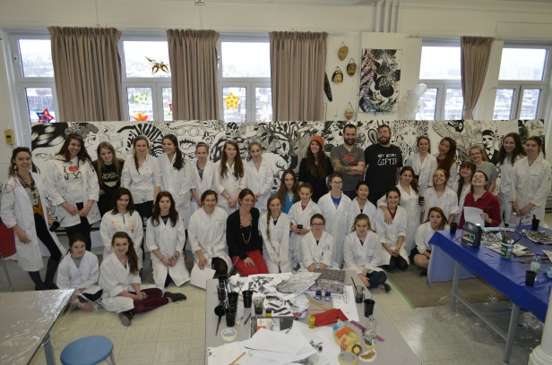 Le jeudi 27 février dernier, 34 filles du Collège Mont Notre-Dame ont laissé libre cours à leur créativité, inspirées et accompagnées par trois artistes montréalais du groupe « En masse ». Ensemble, elles ont créé cinq murales ayant pour thèmes cinq des dix qualités du profil de l’apprenant, au coeur du programme d’éducation internationale, soit communicateur, altruiste, équilibré, audacieux et ouvert d’esprit. En effet, les jeunes élèves artistes avaient pour mission d’imager ces qualités. Les divers styles artistiques et les sujets exploités de manière unique par les élèves sont pourtant reliés avec beaucoup de cohérence grâce à l’utilisation du noir et du blanc, à la manière du style des artistes invités.