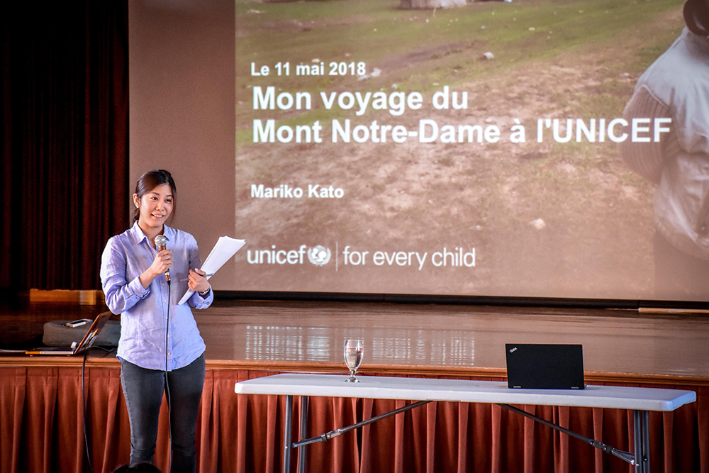 Finissante au Mont Notre-Dame de la promotion 2006, Mme Kato est venue au Québec, une seule année, pour apprendre le français lors d’un échange étudiant. Depuis son tout jeune âge, elle partage une vision humanitaire et désire aider les jeunes qui n’ont pas accès à l’éducation. Aujourd’hui, Mariko Kato travaille pour l’UNICEF du Kirghizistan et contribue à réintroduire le système de l’éducation.