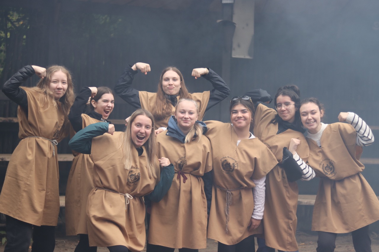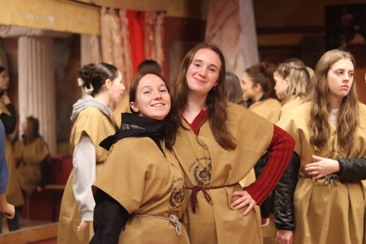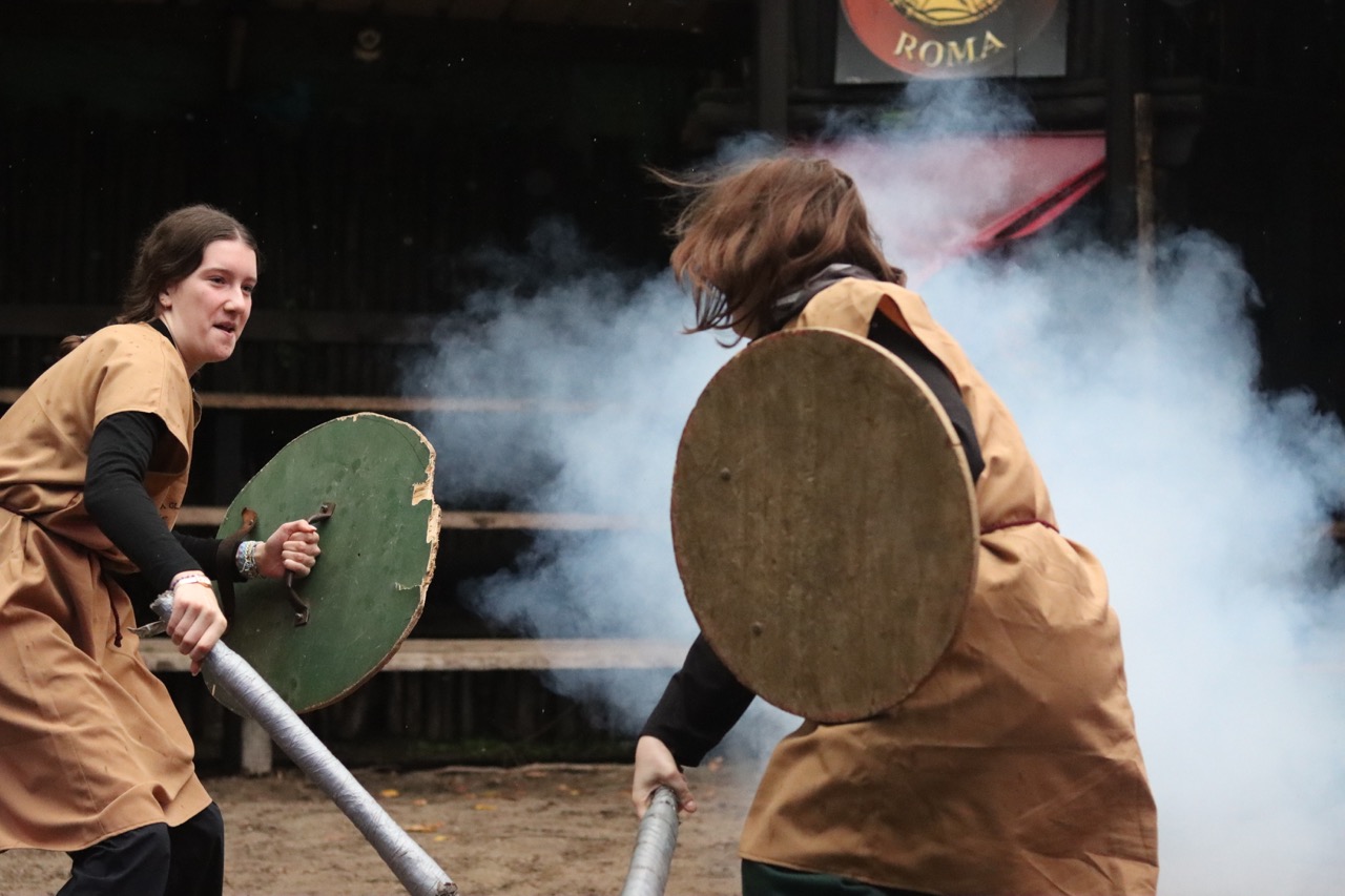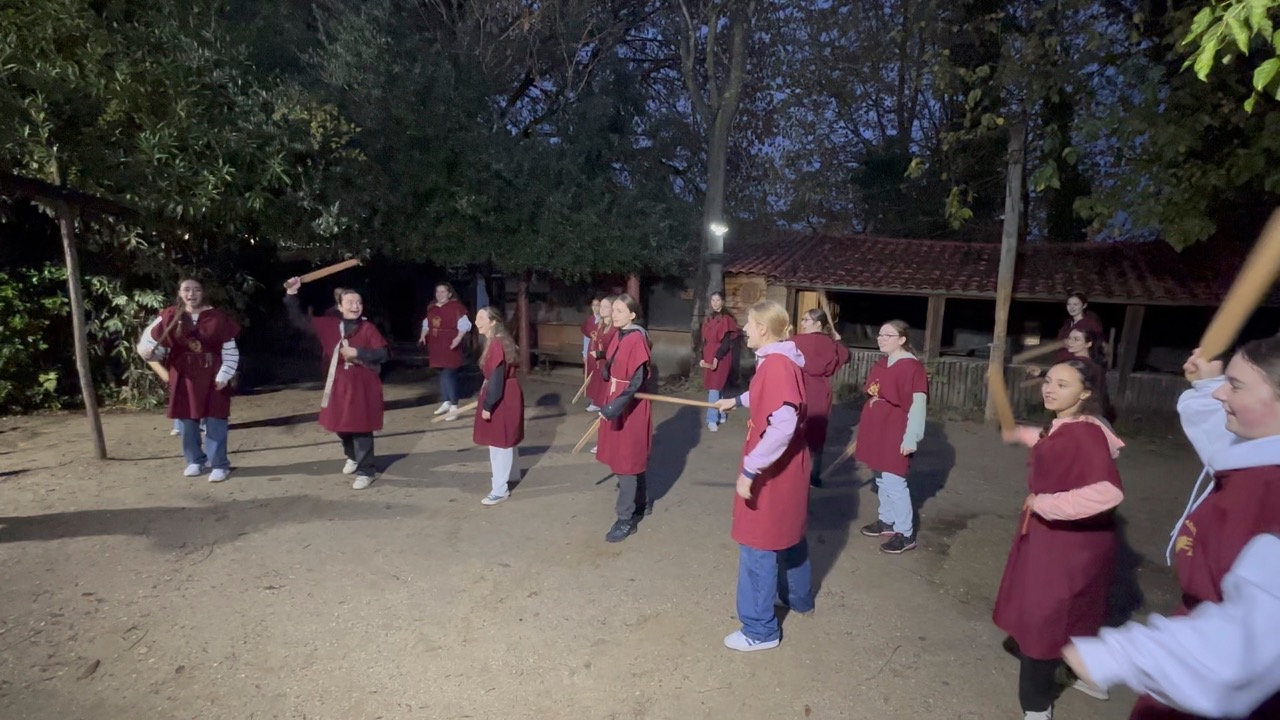 Une activité étonnante attendait nos voyageurs et nos voyageuses, soit un atelier de gladiateurs ! Le groupe était divisé en deux sections : les militaires (légionnaires, prétoriens et gladiateurs) et les civils. Après avoir appris à manier le rudis (épée en bois) et pratiqué certaines techniques utilisées lors des combats de gladiateurs, les élèves se sont vues délivrer un certificat de citoyenneté romaine !