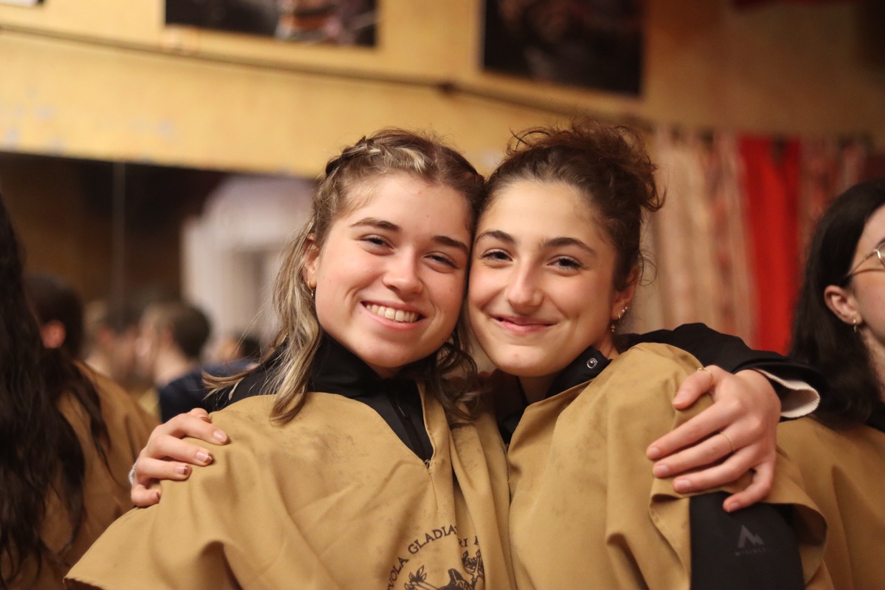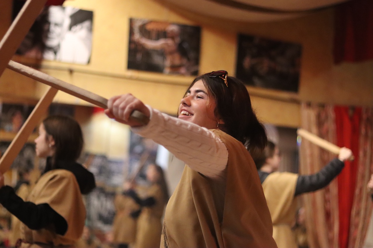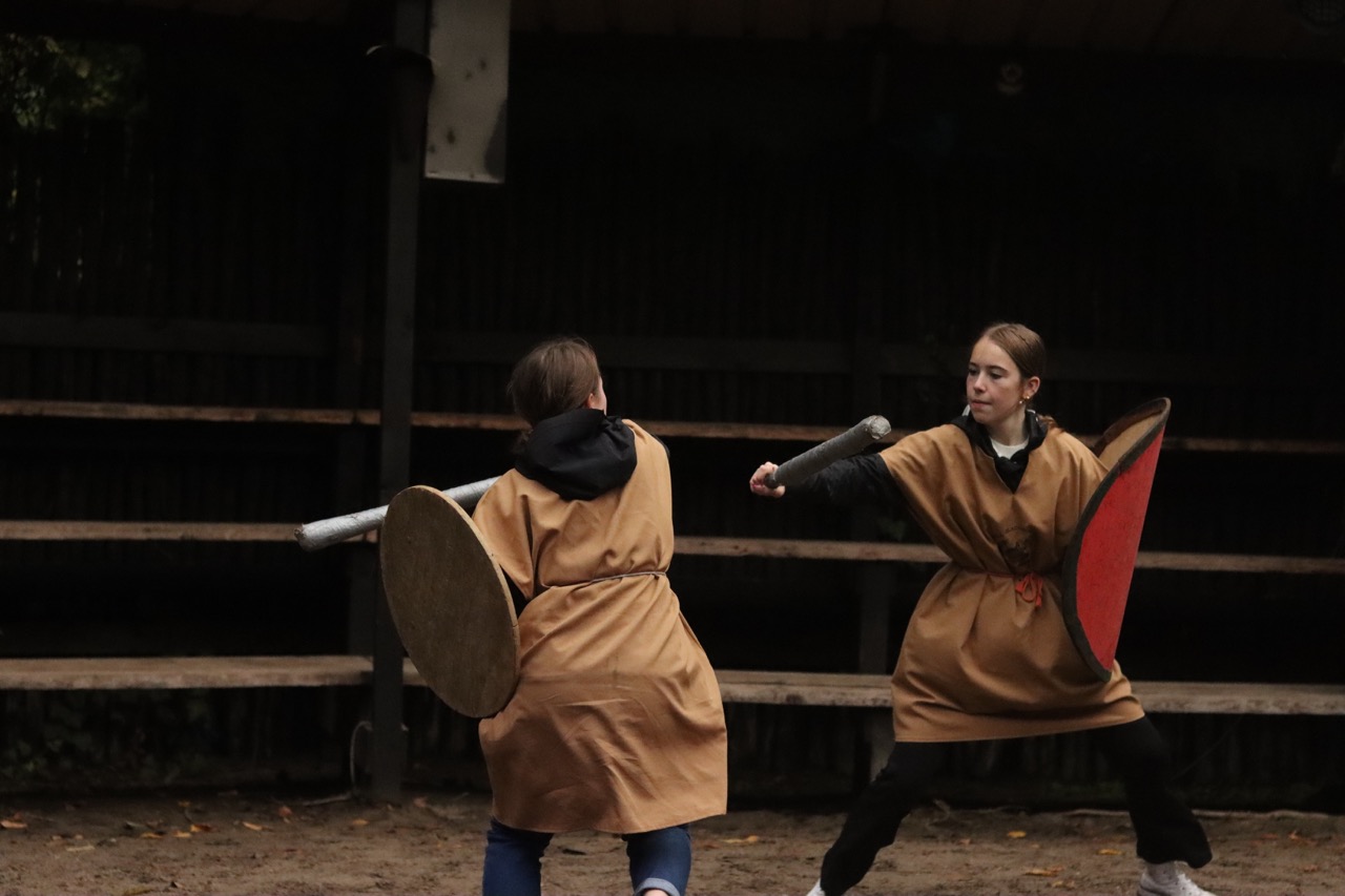 Une activité étonnante attendait nos voyageurs et nos voyageuses, soit un atelier de gladiateurs ! Le groupe était divisé en deux sections : les militaires (légionnaires, prétoriens et gladiateurs) et les civils. Après avoir appris à manier le rudis (épée en bois) et pratiqué certaines techniques utilisées lors des combats de gladiateurs, les élèves se sont vues délivrer un certificat de citoyenneté romaine !