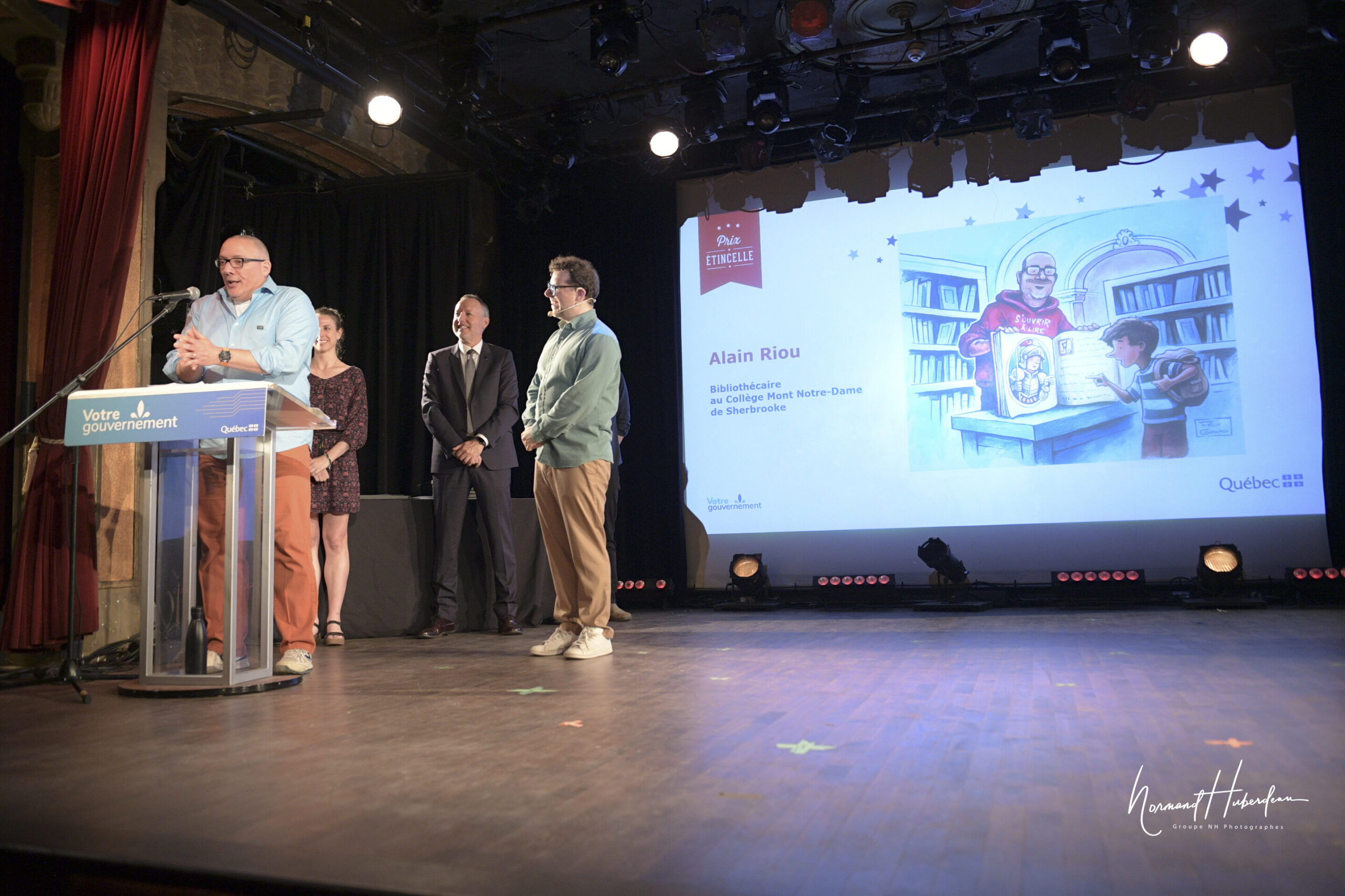 C’est avec une grande fierté que nous vous annonçons qu’Alain Riou, responsable de la bibliothèque du Mont Notre-Dame, a reçu l’un des Prix Étincelle remis par le Ministère de l’Éducation cette semaine. La cérémonie, animée par l’auteur et comédien Simon Boulerice, s’est tenue à Montréal en présence de M. Jean-Bernard Émond, adjoint parlementaire du ministre de l’Éducation (volets éducation préscolaire, enseignement primaire et secondaire et formation professionnelle).
