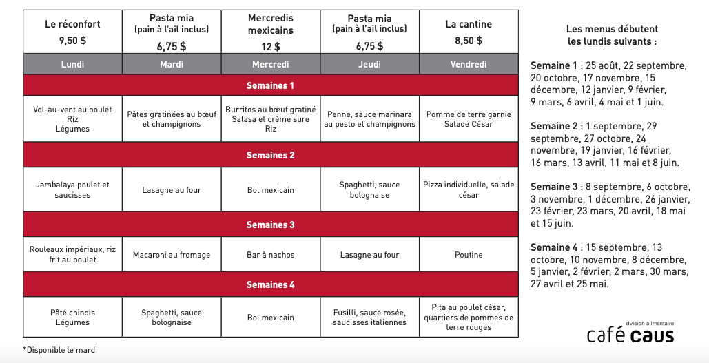 Café Caus, concessionnaire de la cafétéria du Mont Notre-Dame, offre à nos élèves un menu varié et abordable.